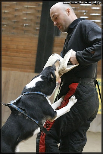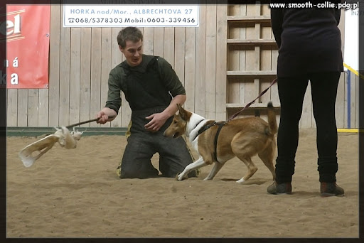 Po ukázce následoval v hale trénink obrany - tento rok jsme měli na srazu k dispozici dokonce tři figuranty :) Perfektní práci s perfektním přístupem předvedli: Václav Ullver, Libor Pavlík a nově také Tomáš Louda. Všichni tři mají s plemenem krátkosrstá kolie na obraně již bohaté zkušenosti a to nejen z našich srazů :)